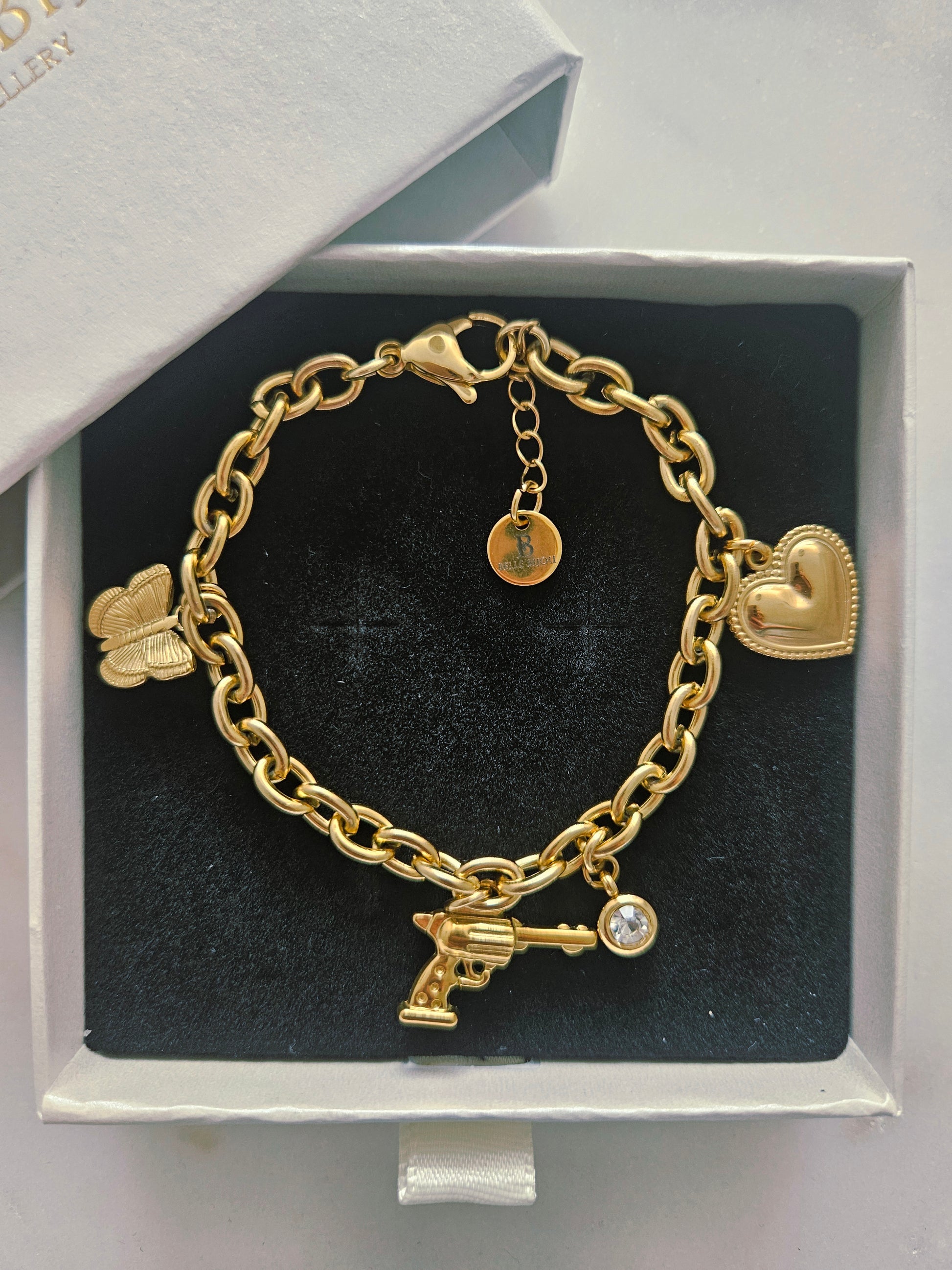Maak een statement met de Baddie bedelarmband, een gedurfde mix van elegantie en attitude. Deze armband is gemaakt van goudkleurig roestvrij staal dat niet verkleurt en perfect bestand is tegen dagelijks gebruik.
