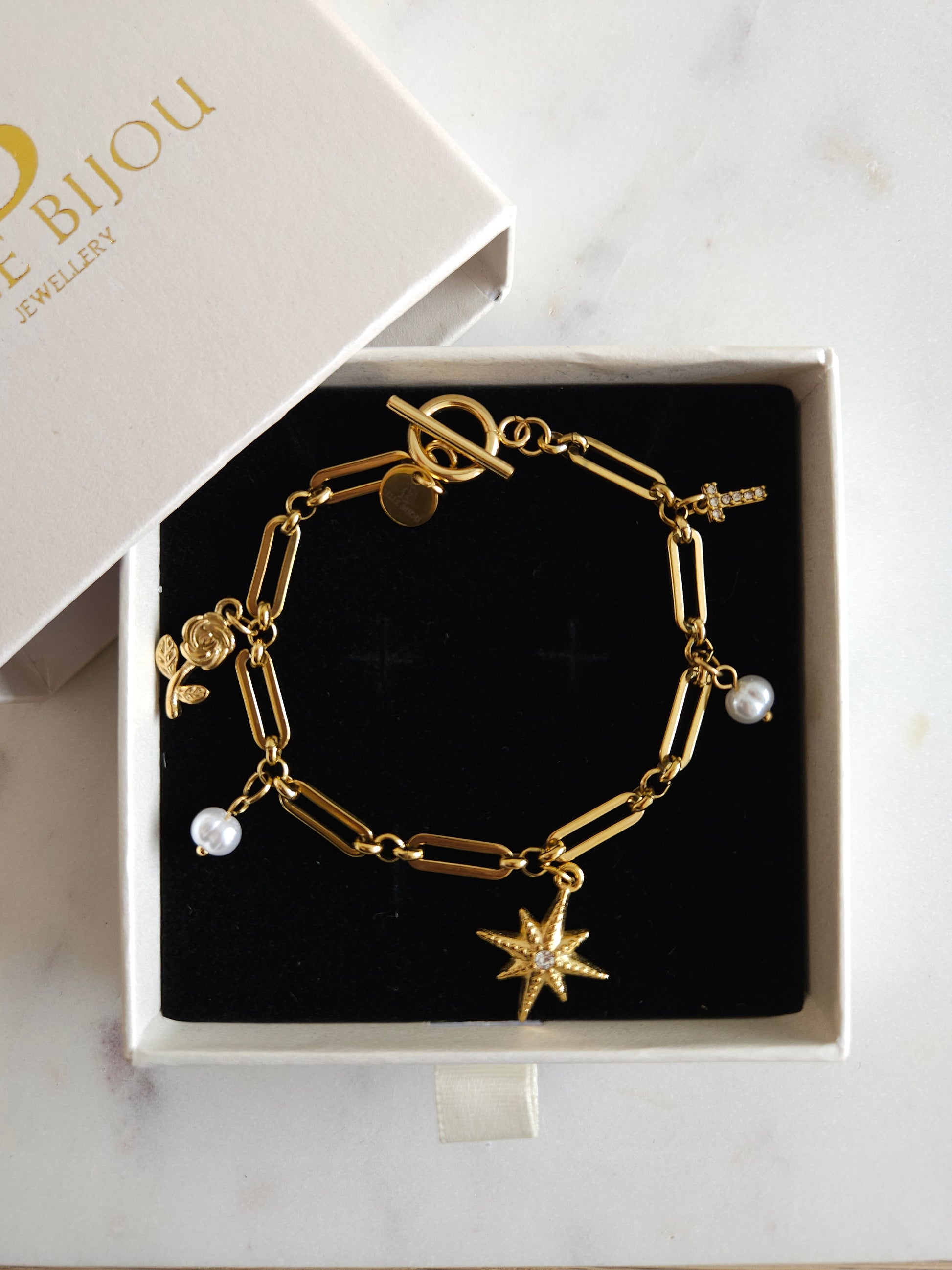 De armband is subtiel maar betekenisvol: een harmonieus ontwerp met religieuze symbolen zoals een kruisje, ster en roos(optioneel aan te passen), perfect om jouw geloof dagelijks bij je te dragen.