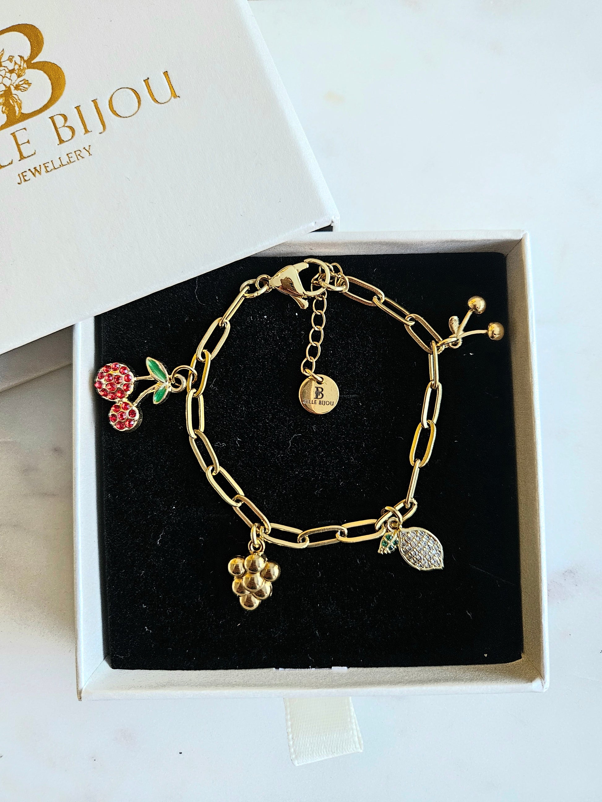 Zin in zomer? Juicy Fruit is jouw frisse statement piece. Deze bedelarmband is versierd met een citroen, een trosje druiven en twee speelse kersen, een kleurrijke knipoog naar zonnige dagen en zoete vibes.