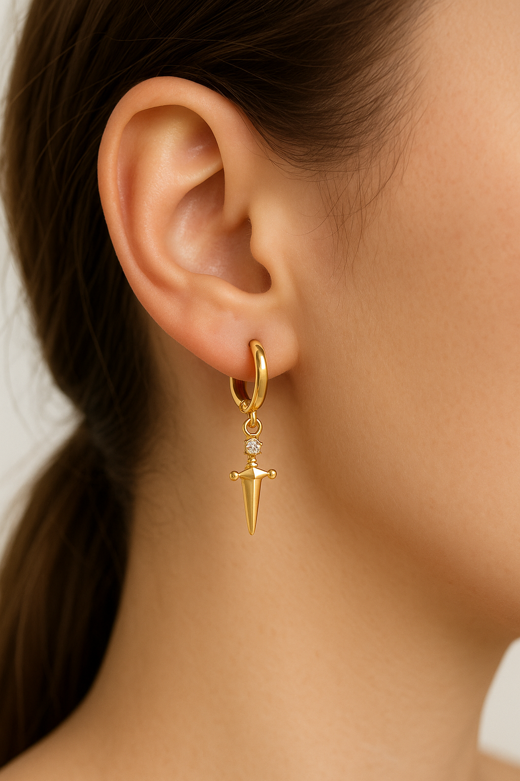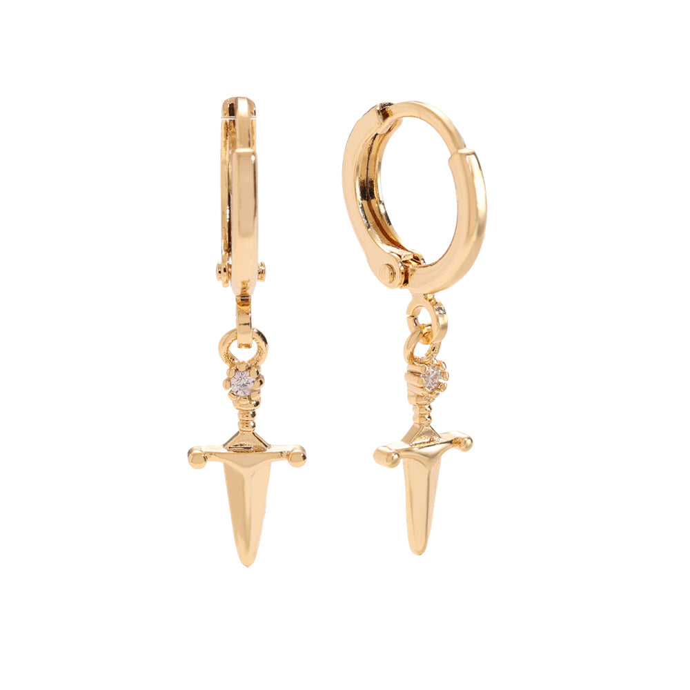 Deze goudkleurige dolk oorbel combineert elegantie met een edgy twist. De verfijnde huggie ring sluit perfect aan op je oor en draagt een gedetailleerde miniatuurzwaard-hanger, subtiel bezet met een fonkelende zirconia-steen.