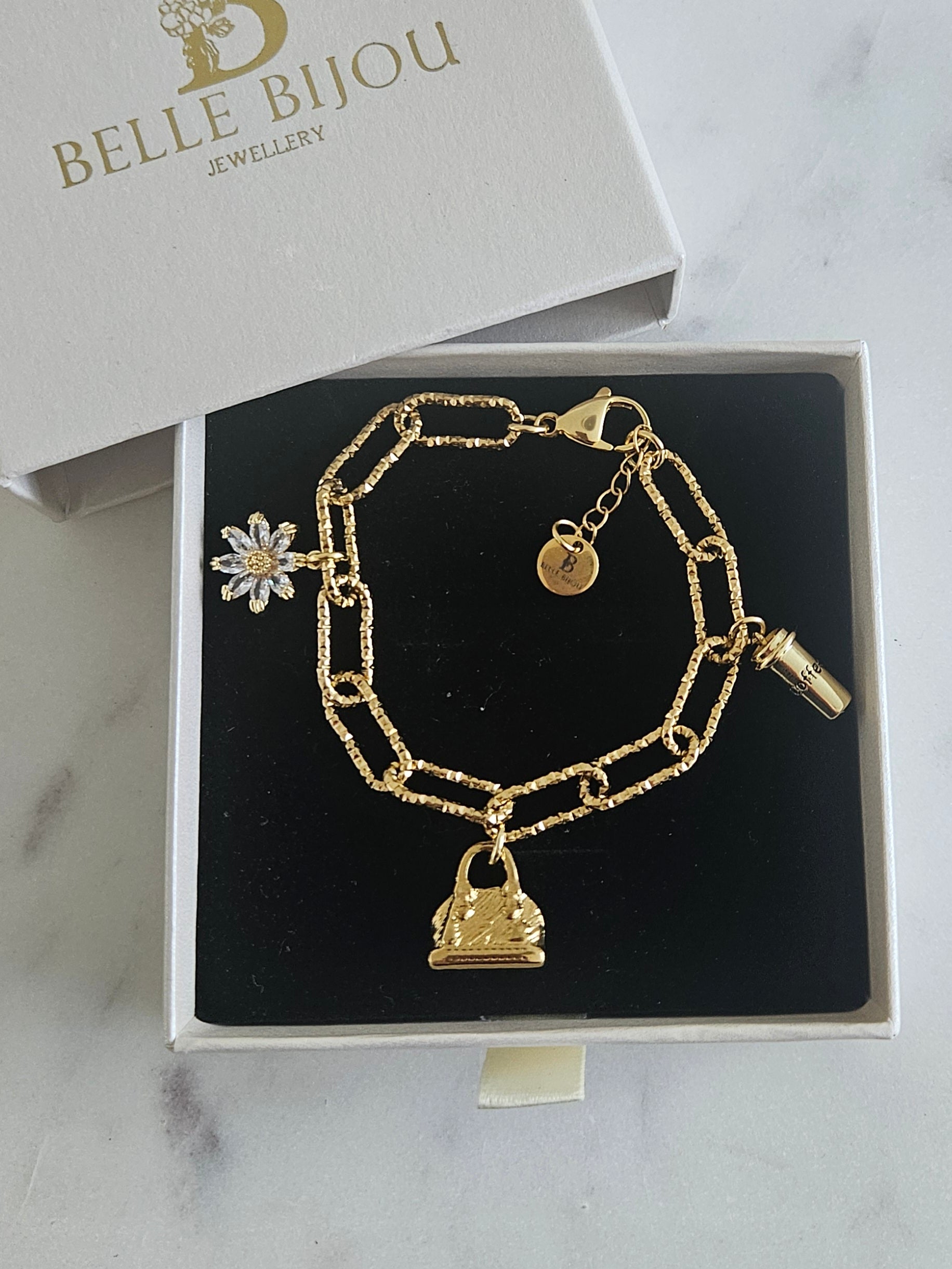 Prachtige statement armband die de vrouwelijkheid accentueert en benadrukt. De mooie bedels zoals het handtasje, koffiebeker en bloem omschrijven precies wie jij bent.