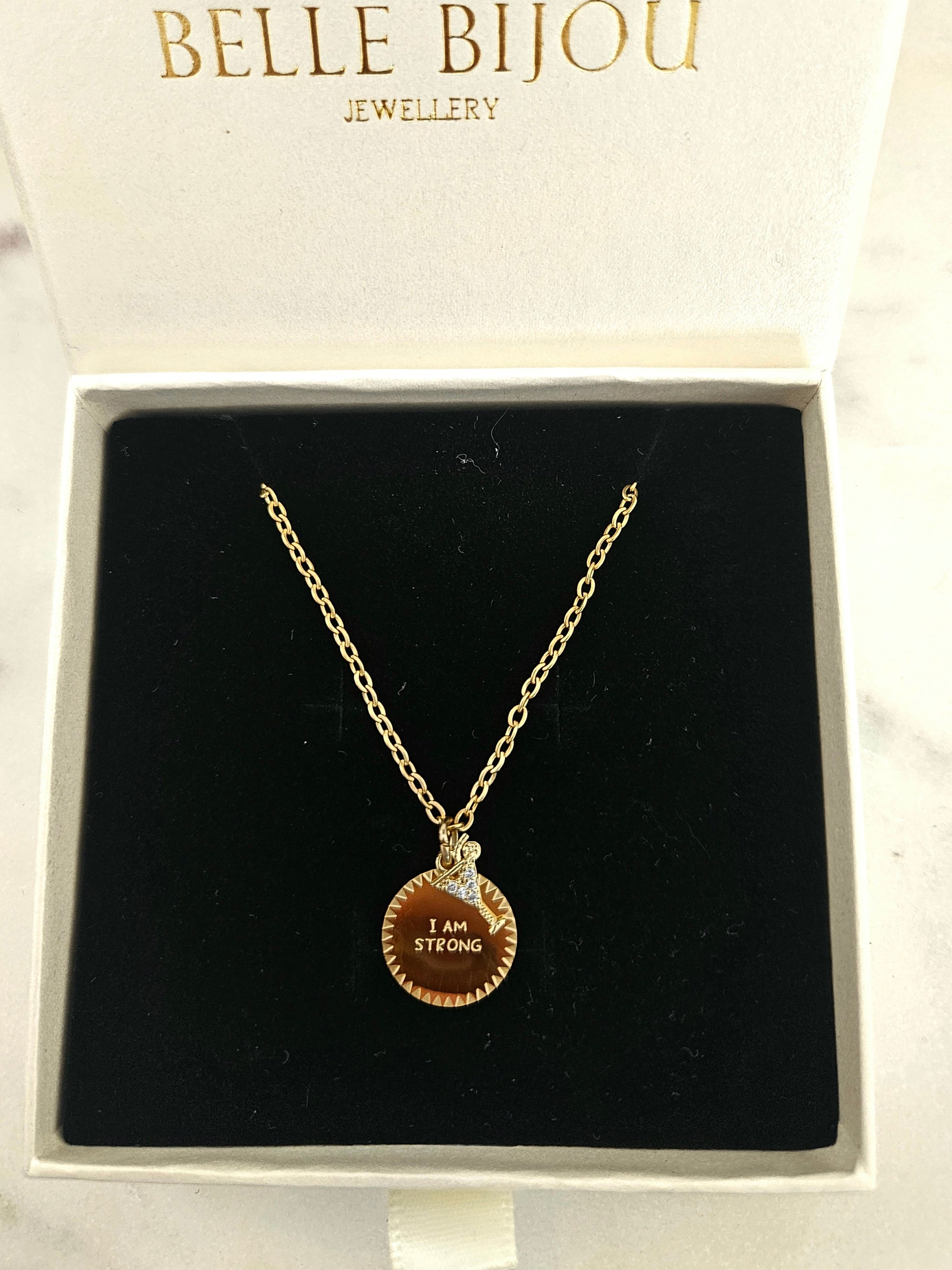 Draag deze ketting als symbool van kracht. Een prachtige medaillon met de tekst "I'm strong" gecombineerd met een martini glas gevuld met zirkonia.